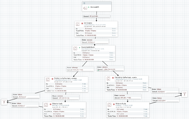 MiNiFi sends the data it reads from sensors and a camera and sends them to a local NiFi gateway. That NiFi gateway sends a stream to my CDP hosted CFM NiFi cluster for processing. This cluster splits the data based on which set of sensors (energy or scada) and then publishes to Kafka topics and populates Kudu tables with an UPSERT.