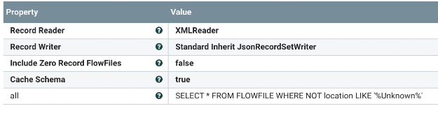- *QueryRecord - XMLReader to JsonRecordSetWriter. Query: SELECT * FROM FLOWFILE WHERE NOT location LIKE '%Unknown%'. This is to remove some locations that are not identified. optional.